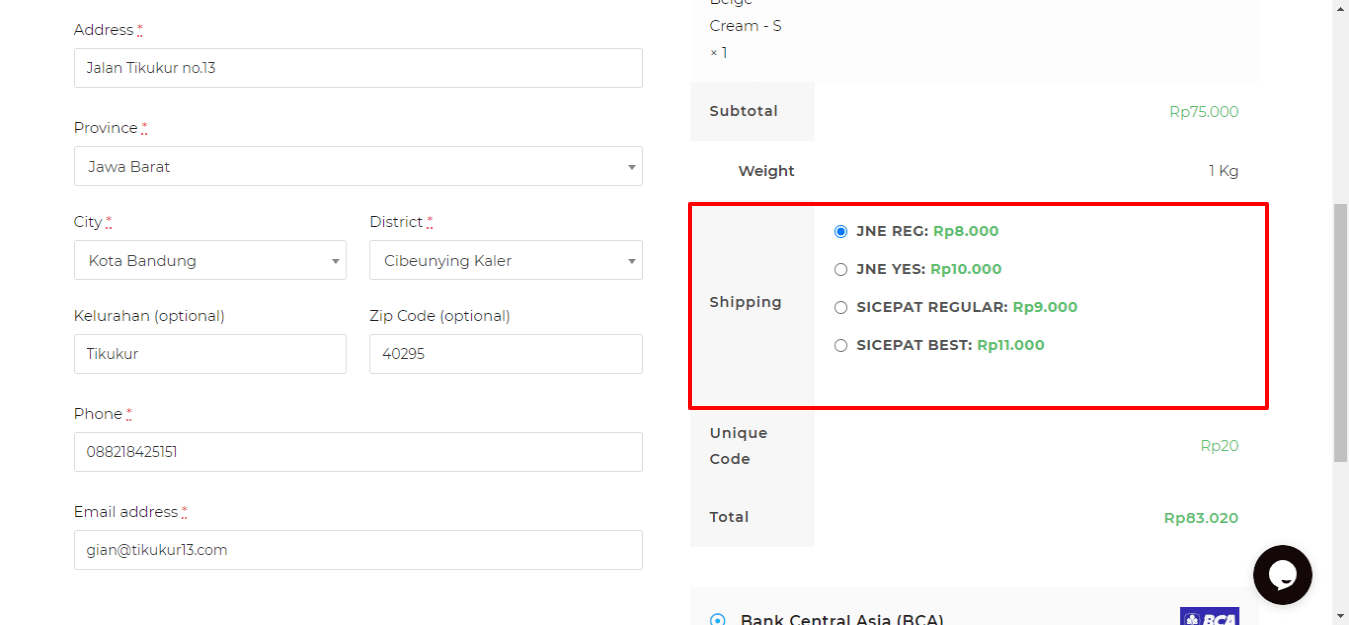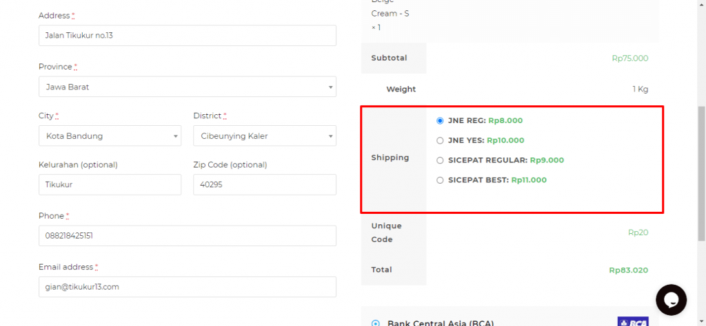 Setelah mengisi kolom Kota dan Kecamatan, kamu akan melihat metode pengiriman disebelah kanan yang bisa kamu pilih