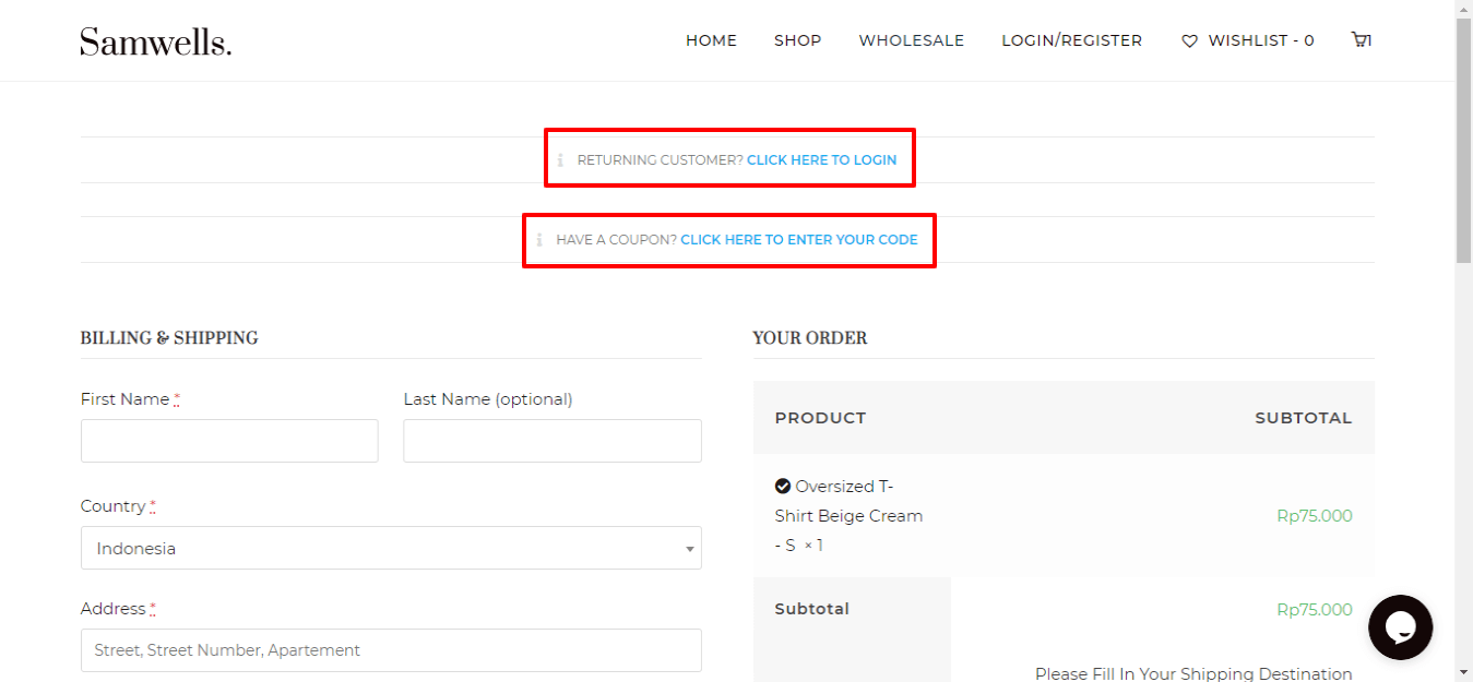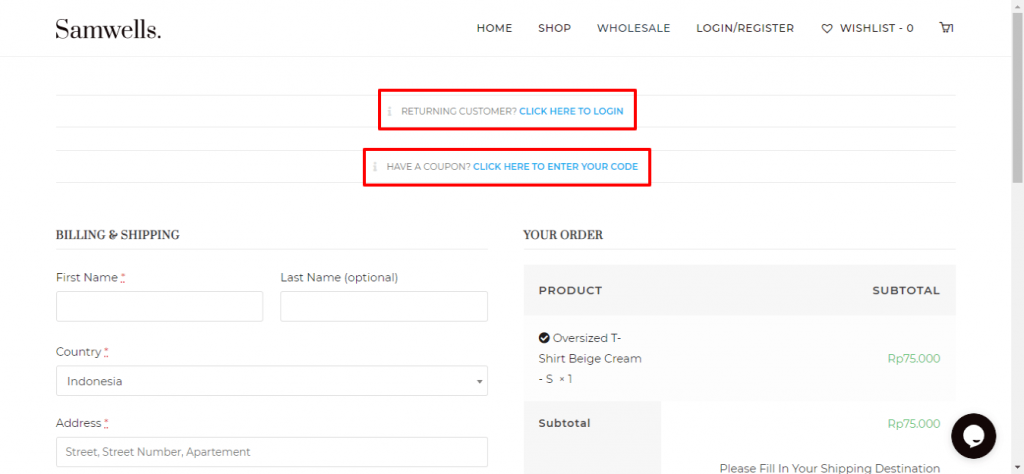 Klik tulisan “Click Here To Login” untuk masuk ke akunmu untuk melanjutkan pembayaran, atau jika kamu belum memiliki akun, kamu bisa langsung mengisi form Billing & Shipping untuk sekaligus membuat akun baru